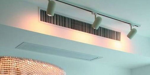 將長條形風(fēng)口(送、回風(fēng)口間隔1米以上)“嵌入”吊頂,既舒適又不影響美觀,適合層高較高的家庭。